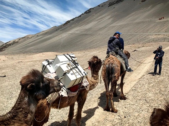 由于安裝地點沒有道路,而且需要翻越四千多米雪山,于是大家就雇了8匹駱駝將物資和儀器運至目的地。隨著海拔升高,大家的高原反應(yīng)越來越明顯。張朝說,大家陸續(xù)感到頭痛欲裂、呼吸困難、惡心嘔吐……但是誰也不敢休息,相互攙扶或是輪流著駱駝,緩慢向山頂推進,只為趕在天黑前到達目的地。