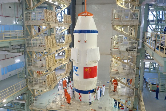 圖為神舟十五號載人飛船船罩組合體吊裝。本報通訊員 高楠拍 攝