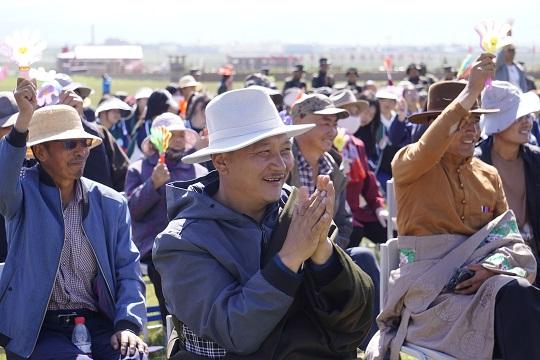 表演唱《和諧家園》、舞蹈《民族舞串燒》、快閃《向幸福出發(fā)》……節(jié)目一個(gè)比一個(gè)精彩,掌聲也一次比一次熱烈,現(xiàn)場觀眾的興致越來越高,獻(xiàn)哈達(dá)、搖彩旗,臺(tái)上臺(tái)下熱烈互動(dòng),高亢嘹亮的歌聲、威風(fēng)震撼的鑼鼓、歡快熱烈的舞蹈、飄動(dòng)飛舞的彩旗,使原本寂靜的金銀灘大草原變成歡樂的海洋。