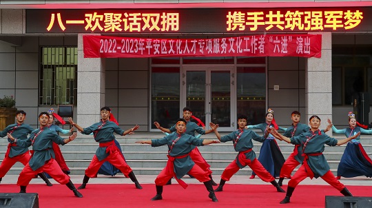 本次活動(dòng)由武警青??傟?duì)文藝輕騎兵、青海省演藝集團(tuán)、海西歌舞團(tuán)等進(jìn)行表演。文藝演出在雄壯震撼的歌舞《向著偉大的夢(mèng)想》中拉開帷幕,情景表演唱《祖國召喚,我喊到》、舞蹈《追風(fēng)》《我的鐵甲夢(mèng)》、紅歌聯(lián)唱《十送紅軍》《英雄贊歌》《不忘初心》、音樂快板《強(qiáng)軍征程新風(fēng)貌》、馬頭琴演奏《草原歡歌》、川劇《變臉》等節(jié)目輪番上演。