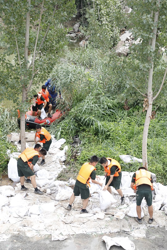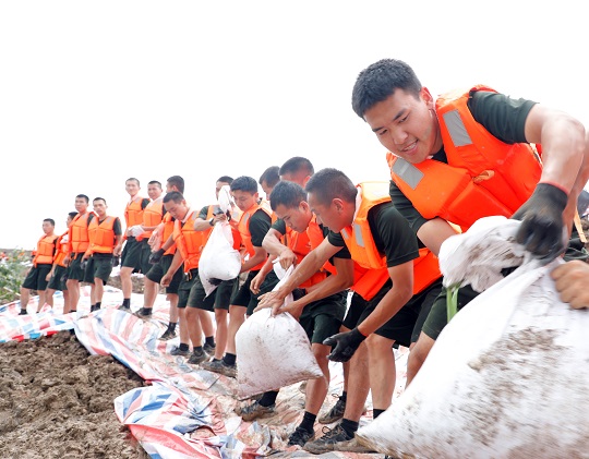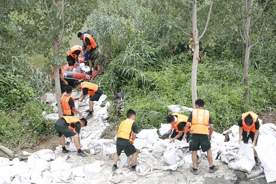 圖為官兵們正在轉(zhuǎn)運沙袋。