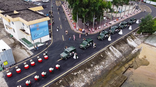 “愛意翻山渡海,終抵良人身畔。今天我們在此,和天空,和海疆,和艦艇一起見證這11對新人人生最重要的時刻。”隨著愛情的煙花在天空綻放,幸福的汽笛在海疆長鳴,熱烈的鑼鼓在廊道敲響,11對新人在親友和來賓的祝福中從海警艦艇緩步走向“情定粵港灣·愛上這片?!奔w婚禮的舞臺。