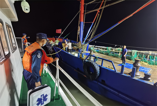 接警后,上海海警局立即調派距離最近的奉賢海警局執(zhí)法艇前往事發(fā)海域救援。23時30分,海警執(zhí)法艇克服能見度不良、海面漁船漁網多等不利因素,在佘山島以東海域發(fā)現漁船并轉移傷員,隨船衛(wèi)生員根據其受傷情況采取傷口消毒、包扎固定等先期救助措施。同時,崇明海警局協(xié)調120急救部門,派出專業(yè)力量到橫沙漁港碼頭待命。