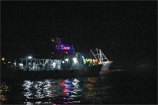 9月20日晚,廣東海警局在廣東陽江黃程山島附近海域救助一艘觸礁擱淺漁船,船上載有26名漁民。