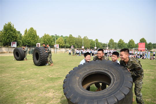 圖為在武警合肥支隊執(zhí)勤某大隊營區(qū),小學生與戰(zhàn)士們組隊進行翻輪胎比賽。