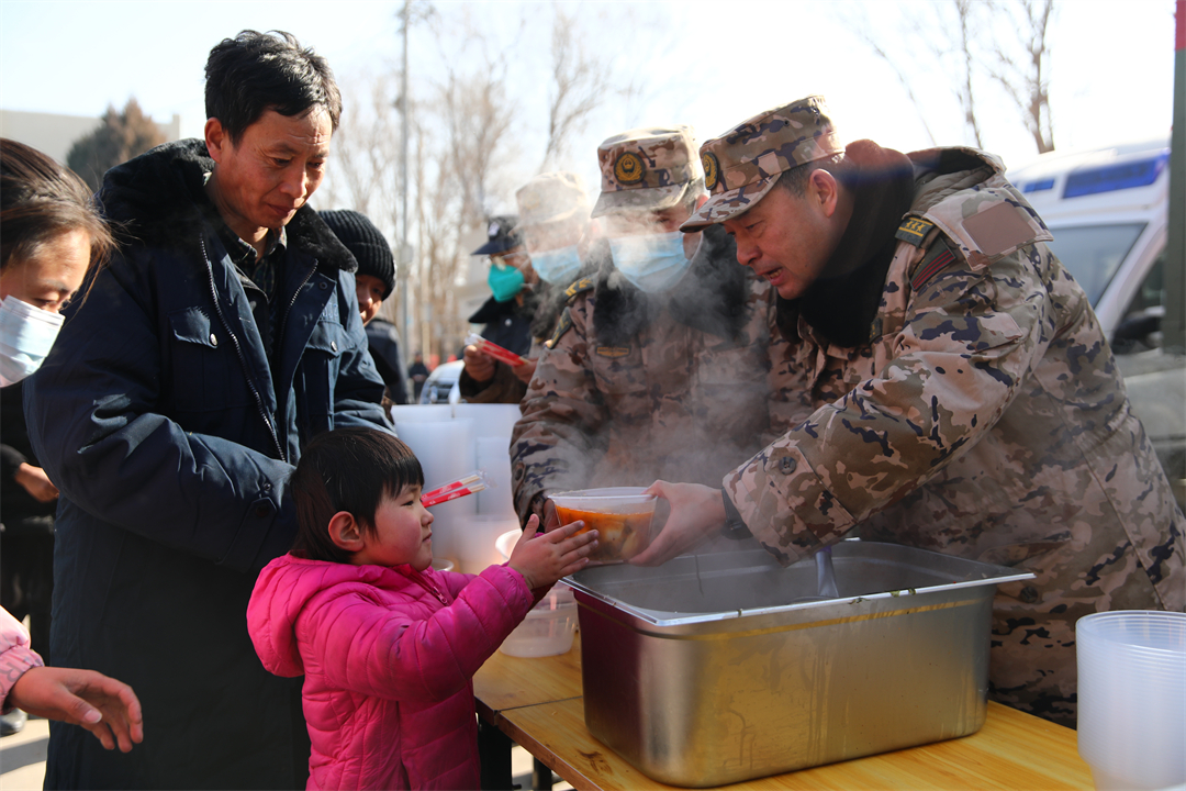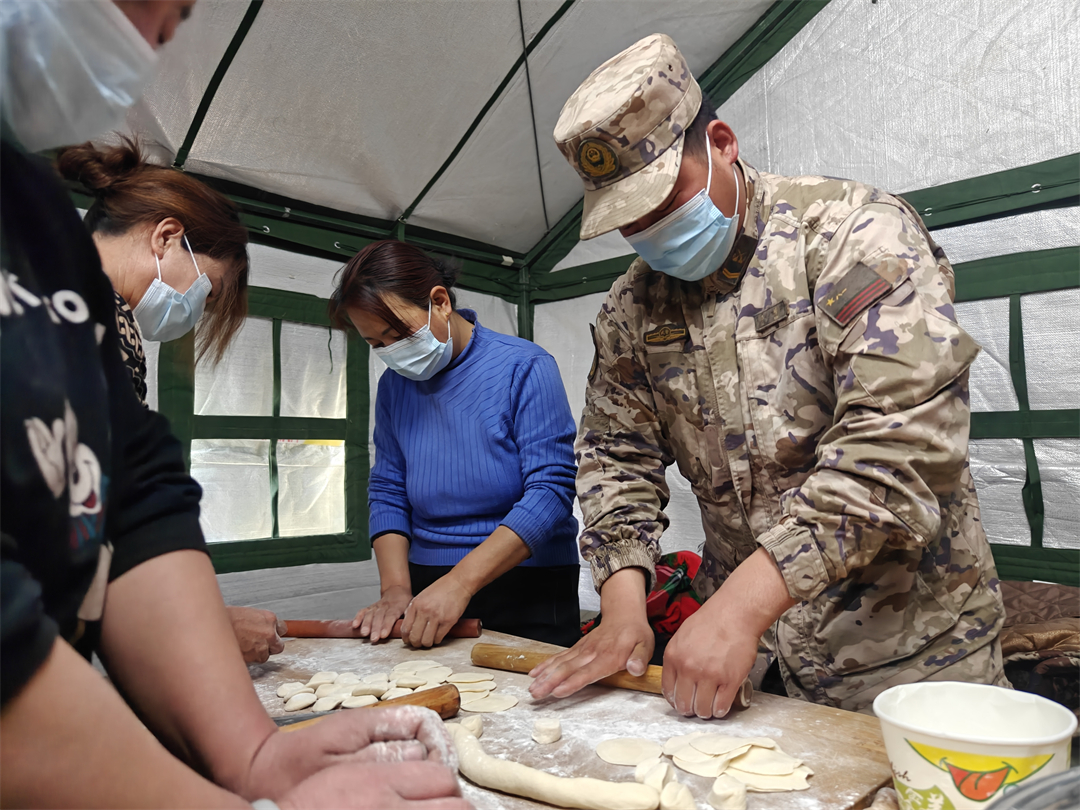 12月22日是冬至,武警青??傟?duì)炊事員們和海東市民和縣中川鄉(xiāng)老鄉(xiāng)一起包餃子。大家一邊包餃子一邊聊天,有說有笑,現(xiàn)場充滿溫情。