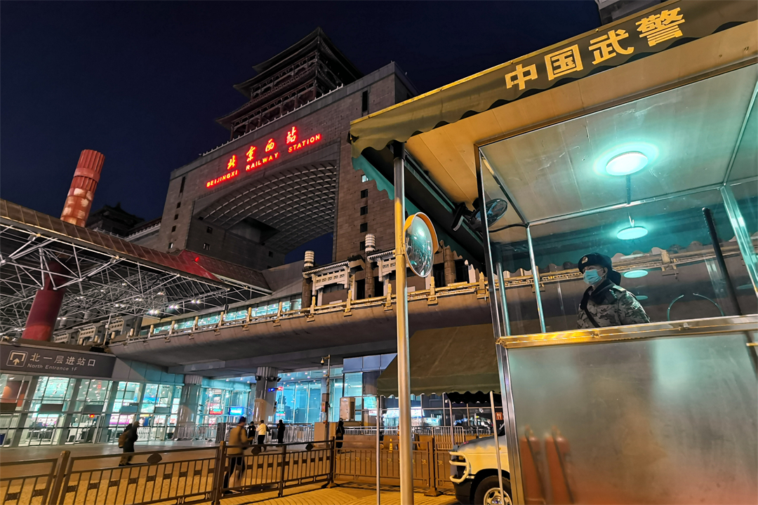 圖為北京西站南廣場(chǎng)武警正在認(rèn)真履職。