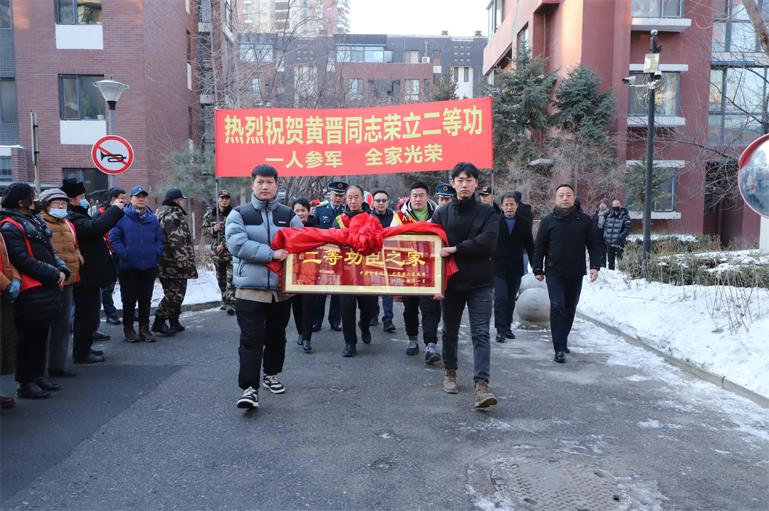 1月4日,遼寧省沈陽市大東區(qū)東方歐博城小區(qū)內(nèi)鑼鼓喧天、人頭攢動。沈陽市大東區(qū)退役軍人事務(wù)局聯(lián)合大東區(qū)人武部和中國人民解放軍某部一起,為榮立二等功的黃晉送來立功喜報和“二等功臣之家”牌匾。