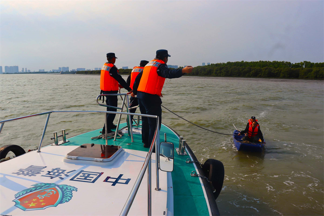 此時(shí),潮水跌宕起伏,執(zhí)法艇在海浪中不斷搖晃,幾次試靠均未成功。執(zhí)法員遂重新研判現(xiàn)場態(tài)勢,鎖定目標(biāo)點(diǎn)后果斷靠幫,將受困群眾轉(zhuǎn)移至執(zhí)法艇。確定無礙后,執(zhí)法員將其送至陳屋村碼頭岸上。據(jù)悉,兩名受困群眾系水東灣海洋公園清理人員,作業(yè)期間因風(fēng)浪較大被困大洲島,幸虧海警執(zhí)法員及時(shí)救助得以脫險(xiǎn)。