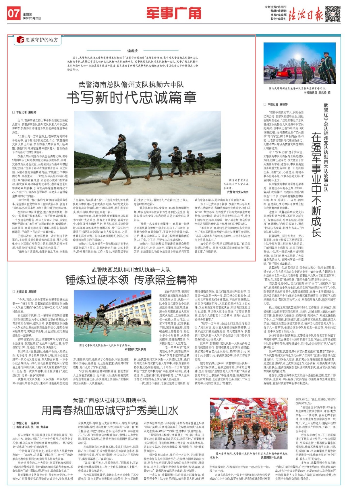 近日,武警部隊政治工作部宣傳局策劃組織了“忠誠守護的地方”主題宣傳活動,集中對武警海南總隊儋州支隊執(zhí)勤六中隊、武警遼寧總隊錦州支隊執(zhí)勤四大隊凌海中隊、武警陜西總隊銅川支隊執(zhí)勤一大隊、武警廣西總隊桂林支隊陽朔中隊四個先進基層單位進行報道,真實反映了新時代武警部隊忠誠擔當使命、守衛(wèi)社會安寧的堅強決心和堅定行動。