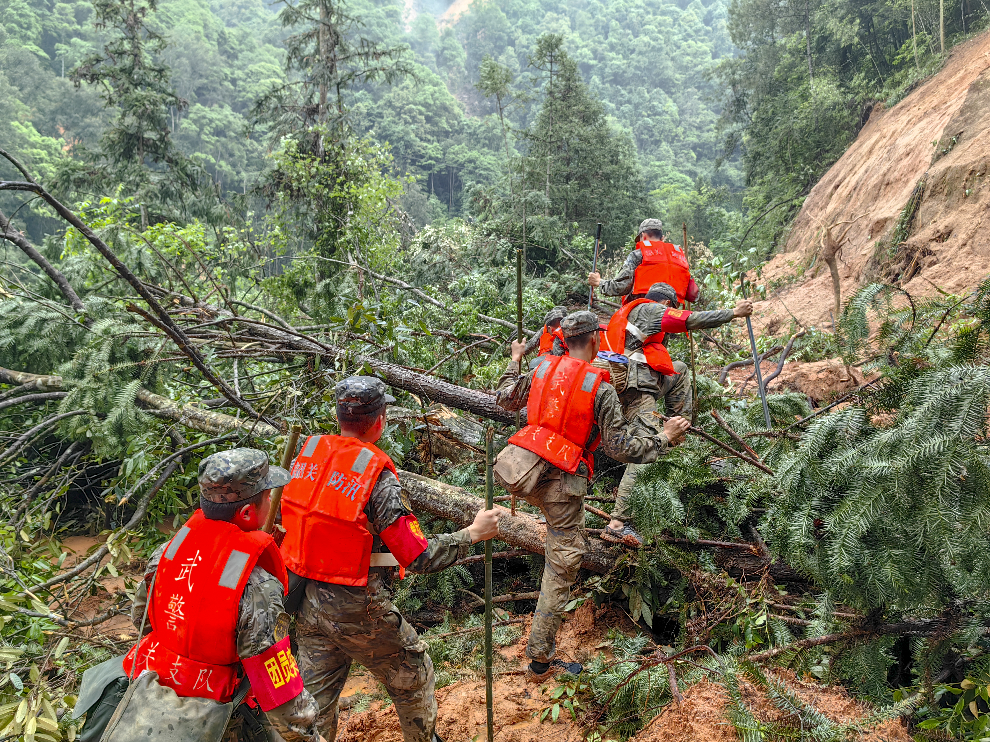 4月23日10時30分,張永建帶領(lǐng)10名官兵擔(dān)負(fù)韶關(guān)江灣鎮(zhèn)梁屋所屬下轄鐘屋、曾屋、下洞、紅山、武洞、瑤族練屋6個自然村的前置勘察和搜救任務(wù),強(qiáng)降暴雨和山體滑坡導(dǎo)致的嚴(yán)峻復(fù)雜環(huán)境使每前行一步都充滿危險。