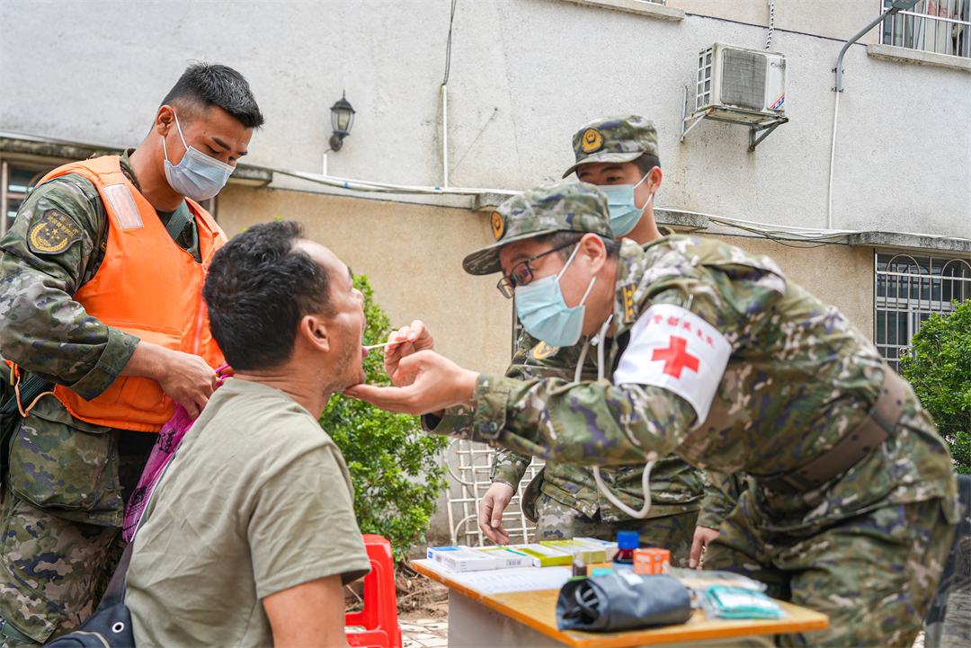 圖為武警廣東總隊韶關(guān)支隊衛(wèi)生隊在撤離前為受難群眾及全體官兵做健康檢查服務(wù)。