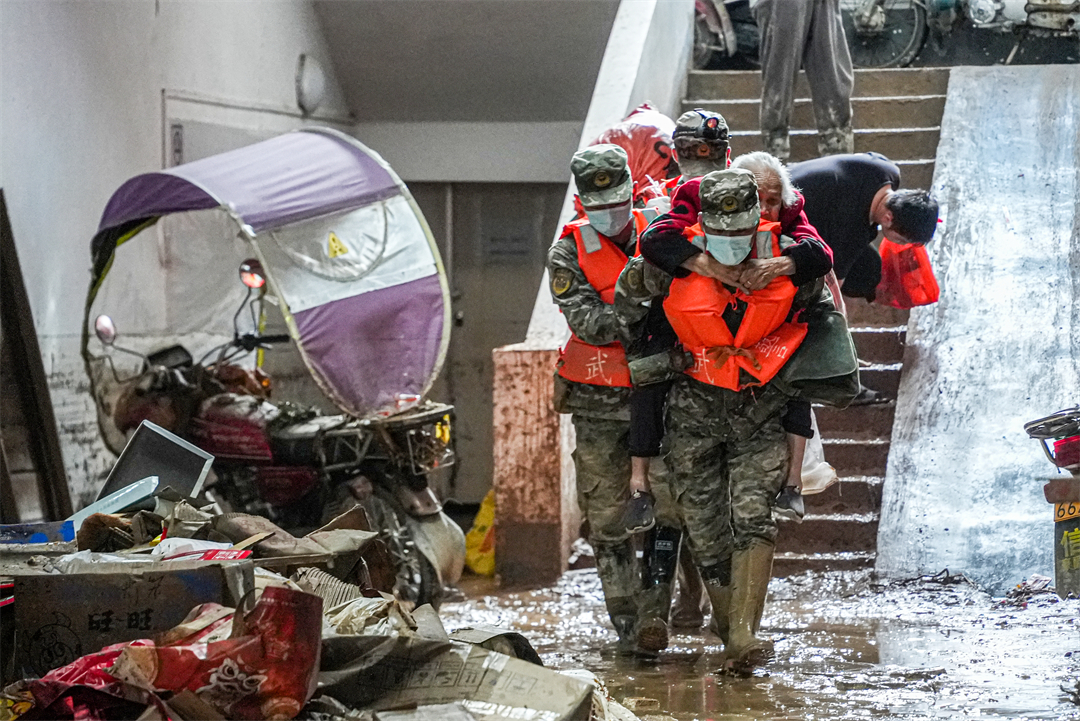 圖為武警廣東總隊韶關(guān)支隊官兵派出20名官兵對江灣鎮(zhèn)城區(qū)片區(qū)進行搜樓,轉(zhuǎn)移受難群眾及物資。