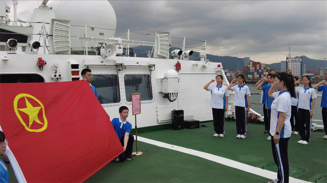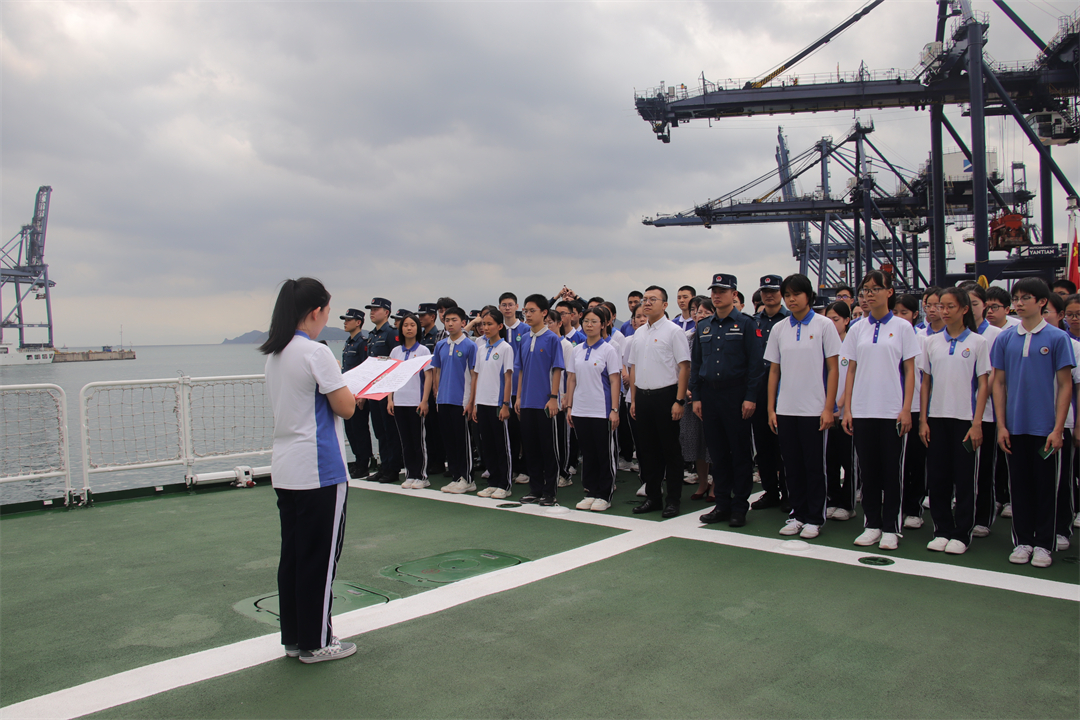 入團儀式在嘹亮的國歌聲中拉開序幕。全體人員在深圳海警局德洲艦甲板上肅立,高聲齊唱國歌。隨后,與會領(lǐng)導(dǎo)為新團員頒發(fā)團徽和團員證。全體團員面向團旗莊嚴(yán)宣誓,兩名團員代表作了慷慨激昂的發(fā)言。最后,羅湖區(qū)教育局領(lǐng)導(dǎo)致辭寄語,勉勵全體團員為中華民族偉大復(fù)興不懈奮斗。