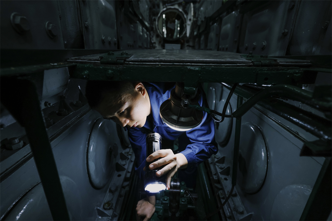 圖為艇員對(duì)潛艇進(jìn)行例行檢查。