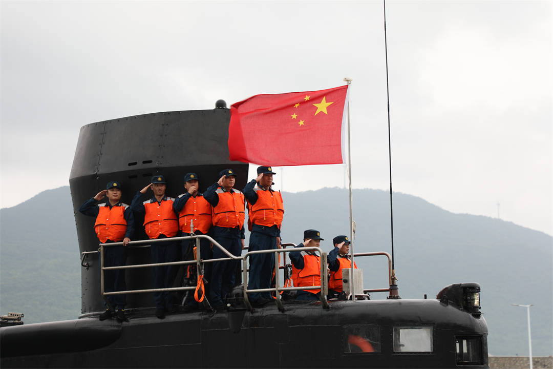 圖為潛艇遠(yuǎn)航歸來,艦橋值更人員行舉手禮。