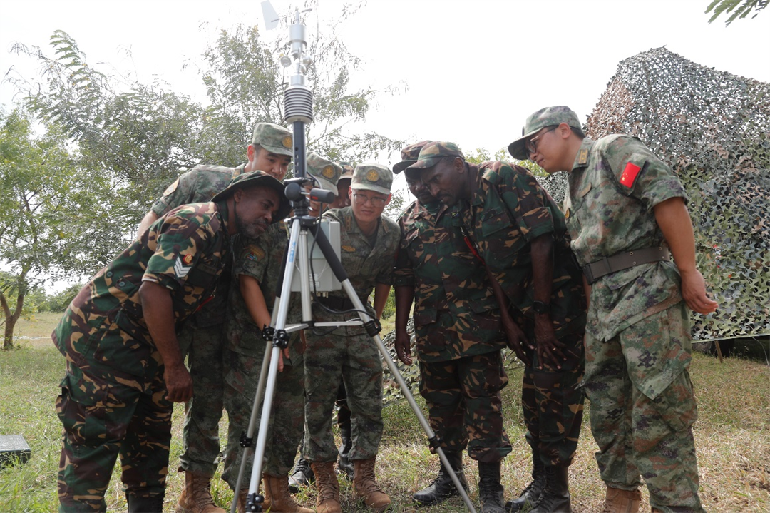 圖為中坦軍官兵進(jìn)行氣象觀測(cè)技術(shù)交流。