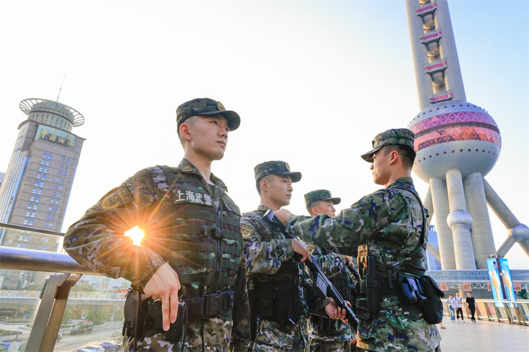 迎著霞光,武警上??傟?duì)執(zhí)勤第二支隊(duì)某中隊(duì)巡邏車穿梭在上海市浦東新區(qū)陸家嘴金融貿(mào)易區(qū),這里是官兵常年守護(hù)的地方。