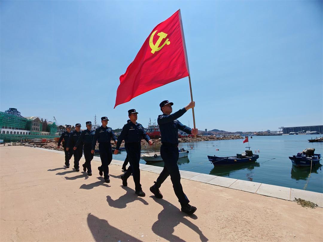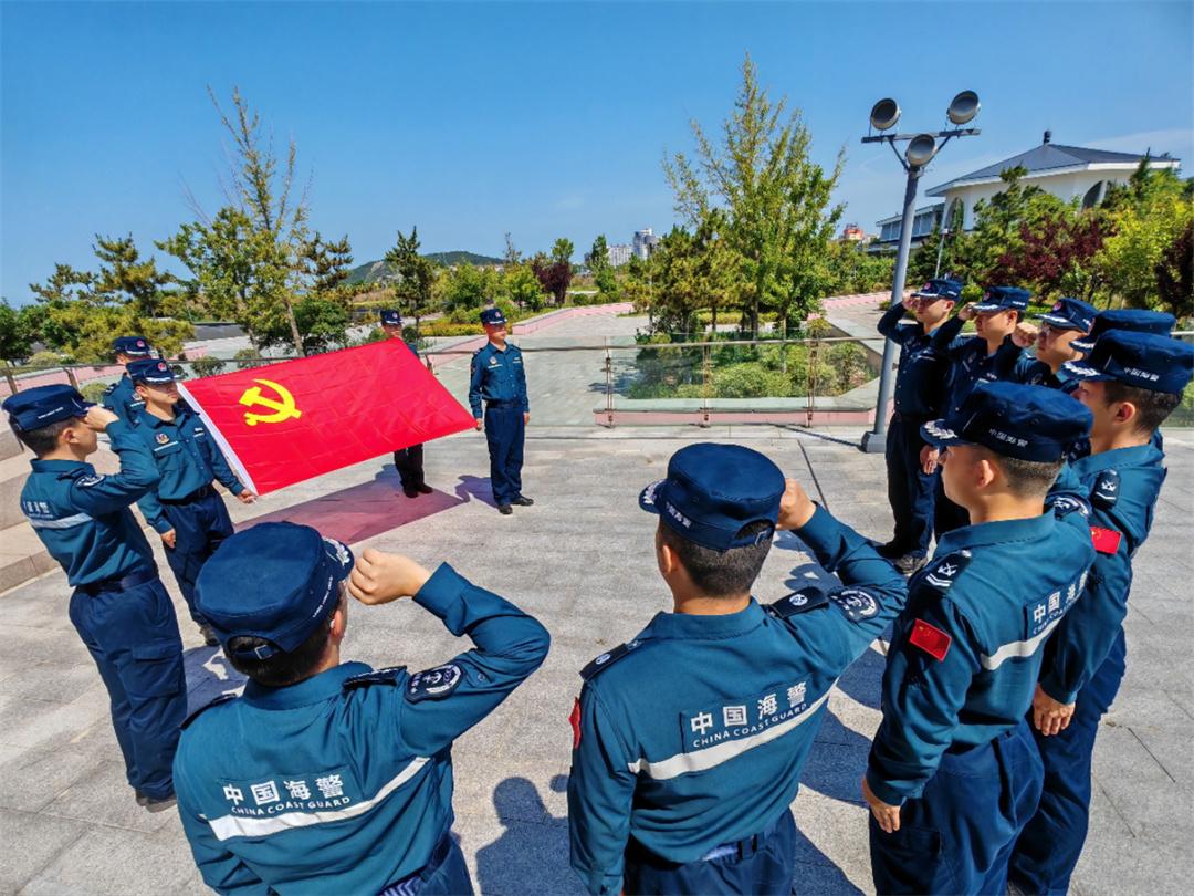 圖為山東煙臺(tái)海警局長島工作站組織執(zhí)法員重溫入黨誓詞。盧煜萱 攝
