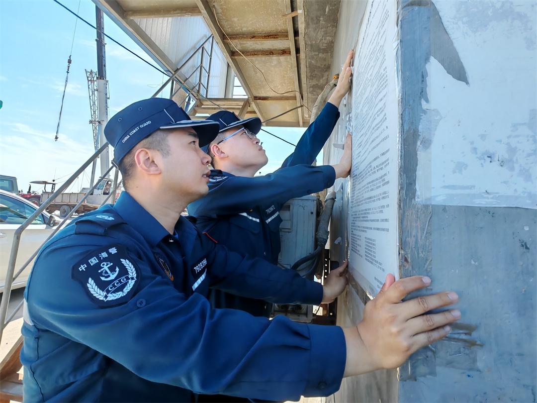 圖為山東煙臺(tái)海警局長島工作站執(zhí)法員在轄區(qū)北長山島北城碼頭張貼執(zhí)法公告。盧煜萱 攝