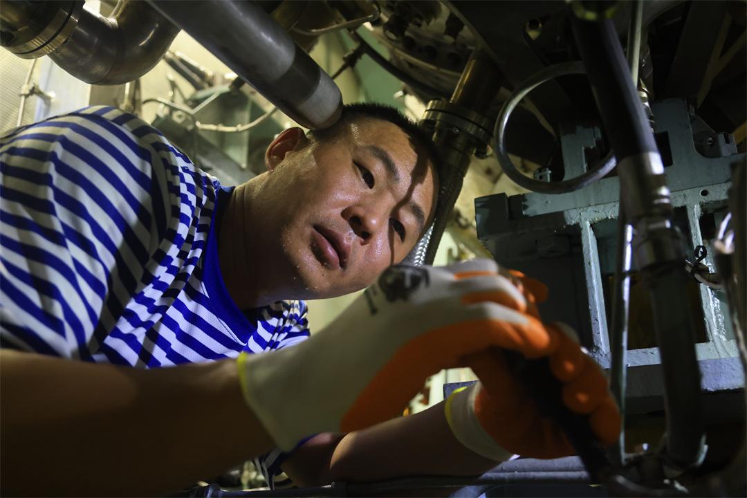 圖為海軍海口艦技師周帥在戰(zhàn)位維修裝備。