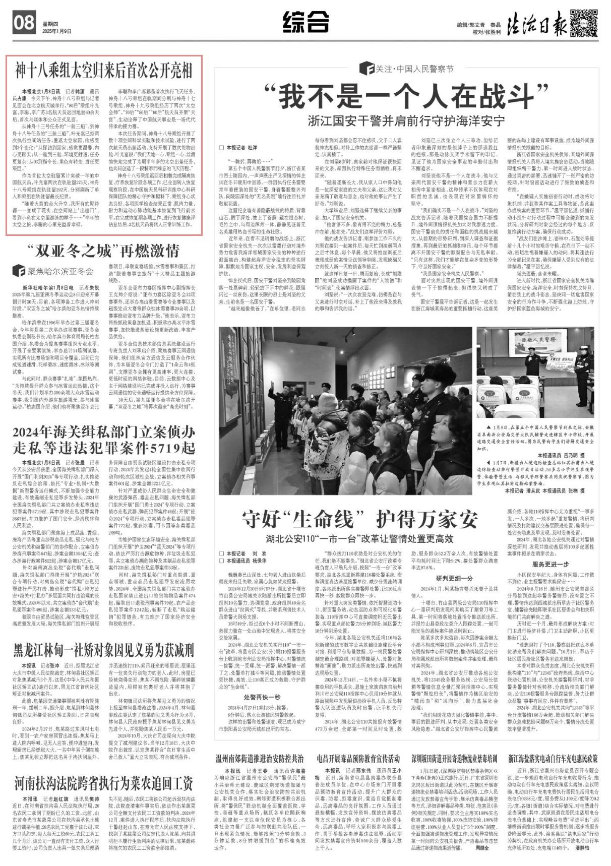 航天員李聰和李廣蘇都是首次執(zhí)行飛天任務(wù),神舟十八號乘組在軌期間分別與神舟十七號乘組、神舟十九號乘組經(jīng)歷了兩次“太空會師”?!?0后”“80后”“90后”航天員齊聚“天宮”,生動詮釋了中國航天事業(yè)是一場代代傳承的接力賽。