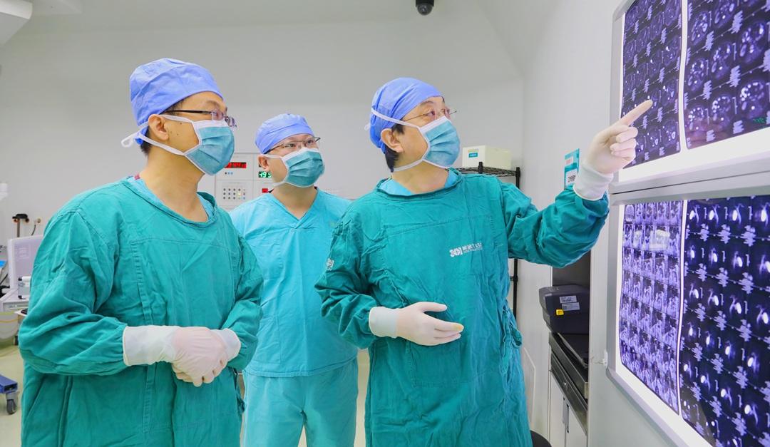 圖為姜凱主任團(tuán)隊一邊查閱核磁膠片一邊討論手術(shù)細(xì)節(jié),制定周密方案,確保手術(shù)萬無一失。