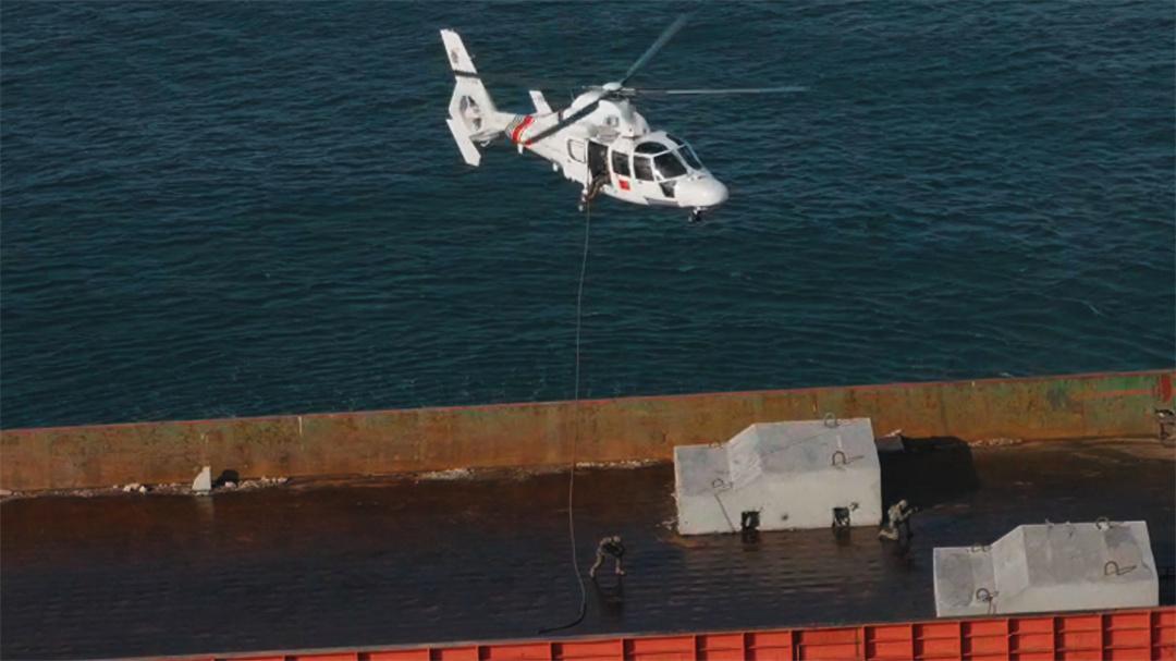 最刺激的當(dāng)數(shù)“甲板突襲”現(xiàn)場(chǎng):執(zhí)法員從直升機(jī)索降而下,快艇同時(shí)抵近包抄,水炮精準(zhǔn)壓制目標(biāo)船舵機(jī),整套動(dòng)作行云流水。