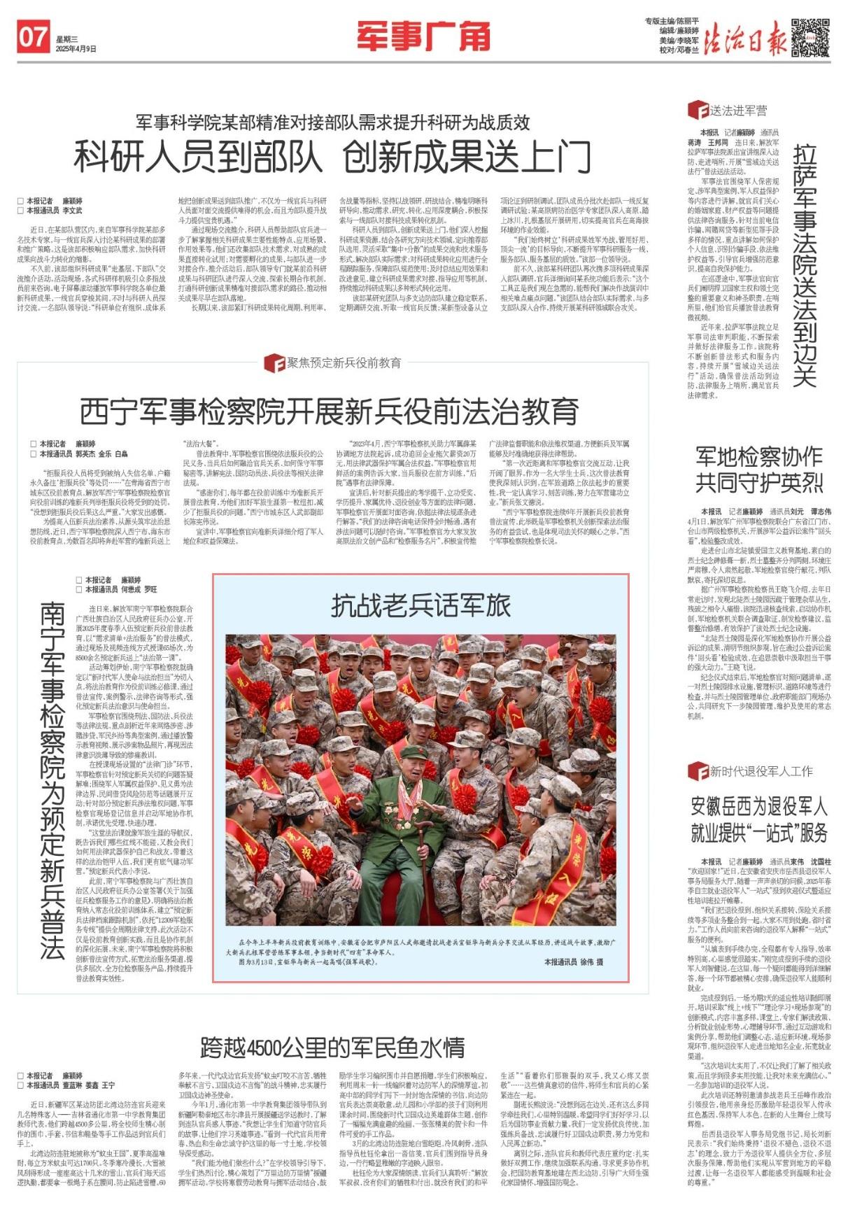 在今年上半年新兵役前教育訓(xùn)練中,安徽省合肥市廬陽區(qū)人武部邀請(qǐng)抗戰(zhàn)老兵宣鉅華與新兵分享交流從軍經(jīng)歷,講述戰(zhàn)斗故事,激勵(lì)廣大新兵扎根軍營(yíng)苦練軍事本領(lǐng),爭(zhēng)當(dāng)新時(shí)代“四有”革命軍人。