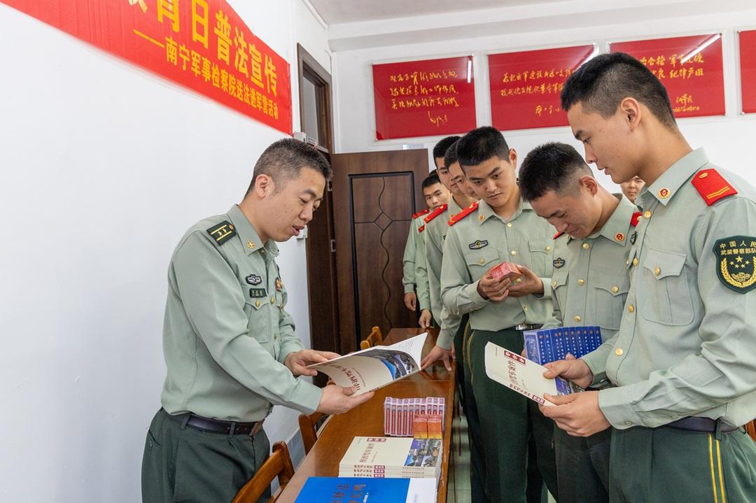 圖為向武警官兵發(fā)放法律學(xué)習(xí)書籍。