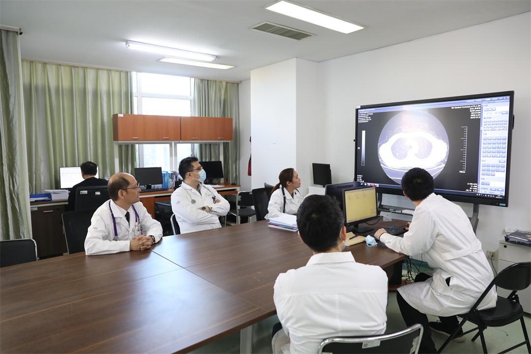 圖為胸外科主任宋偉安帶領(lǐng)團隊研究胸部CT和病情資料。