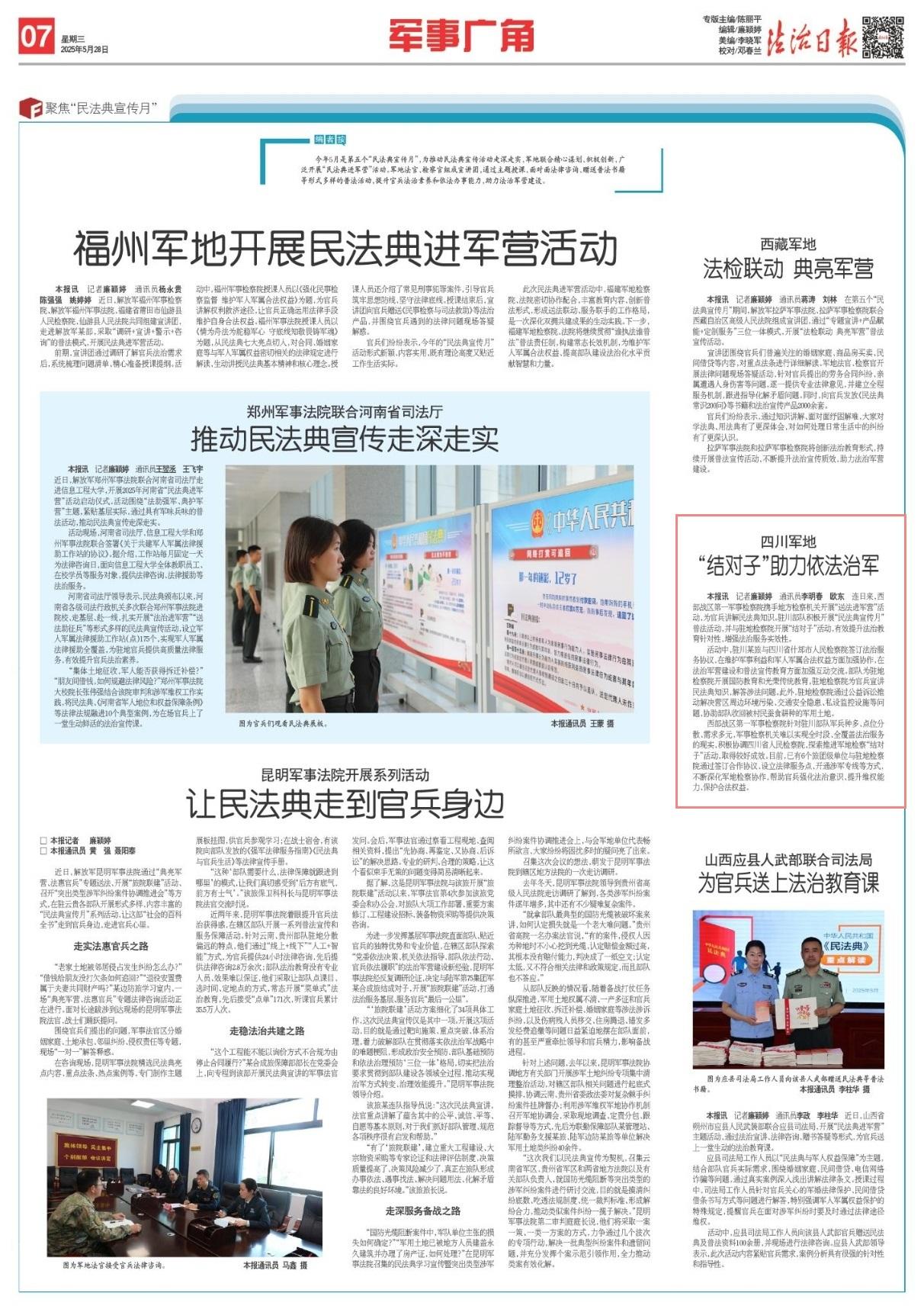 連日來,西部戰(zhàn)區(qū)第一軍事檢察院攜手地方檢察機(jī)關(guān)開展“送法進(jìn)軍營”活動,為官兵講解民法典知識。駐川部隊(duì)積極開展“民法典宣傳月”普法活動,并與駐地檢察院開展“結(jié)對子”活動,有效提升法治教育針對性,增強(qiáng)法治服務(wù)實(shí)效性。