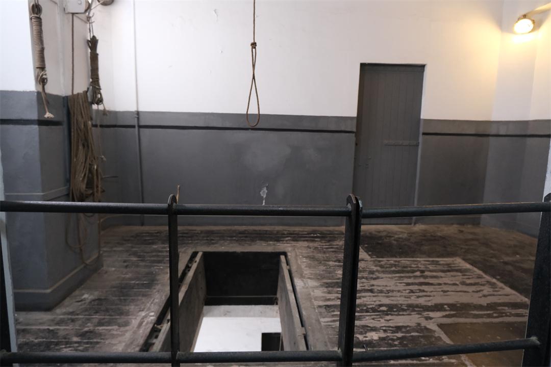 陳列館三樓的日本戰(zhàn)犯關(guān)押審判執(zhí)行展廳內(nèi),保留著一間室內(nèi)刑場,又叫絞刑房。面積18平方米,四面是鋼筋水泥墻壁,其中一面2米高處開有兩扇氣窗。地坪中間開一1.8平方米方孔,方孔兩側(cè)裝有兩塊活動地板,正對方孔的房頂上有一根管狀形的絞架。施錦秀說:“1946年4月22日上午,被判處死刑的鏑木正隆等5名日本戰(zhàn)犯,按照軍階高低逐個在提籃橋監(jiān)獄執(zhí)行絞刑。”