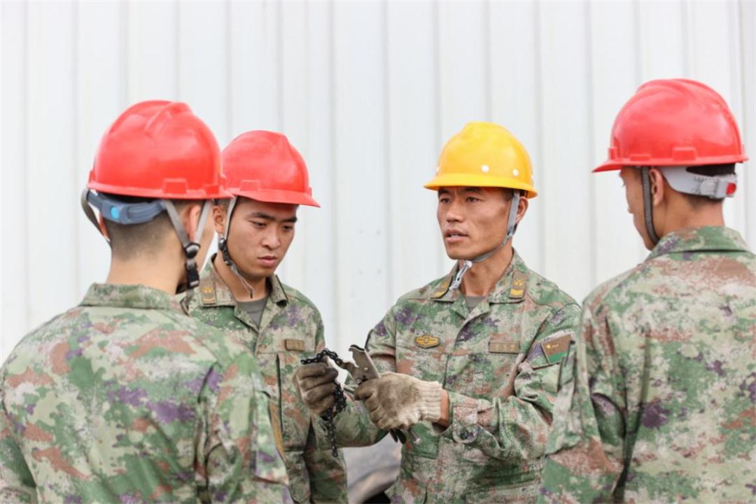 圖為雷耀明(右二)向年輕戰(zhàn)友講解機具使用技巧。鄭弘揚 攝