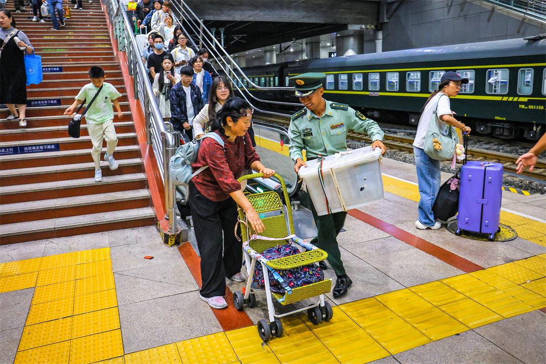 圖為執(zhí)勤武警幫助旅客搬運(yùn)大件行李。鄒東聲 攝