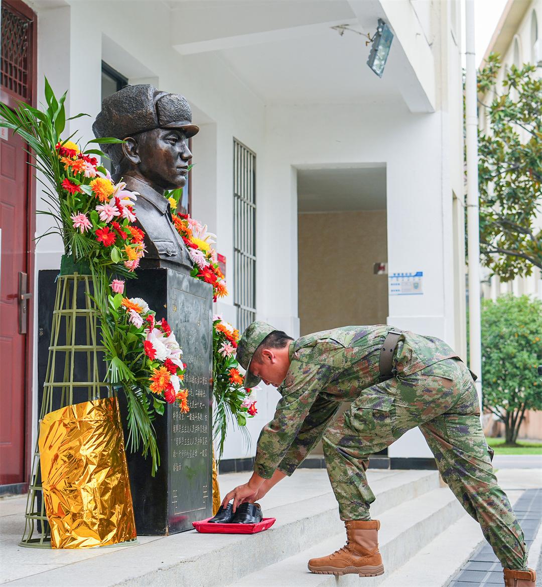 圖為全體官兵面向?qū)O占元老排長(zhǎng)銅像脫帽,肅立默哀,致以深切緬懷。劉東祥 攝