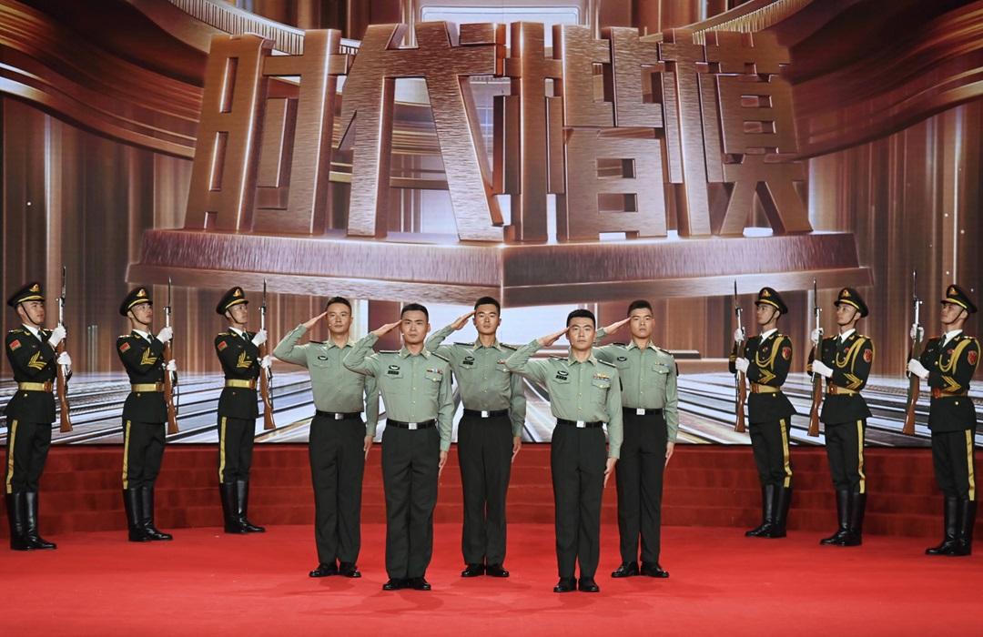 圖為在“時(shí)代楷模”發(fā)布儀式上,陸軍第八十二集團(tuán)軍某旅“劉老莊連”官兵代表領(lǐng)取“時(shí)代楷?!豹勁坪妥C書。張永進(jìn) 攝