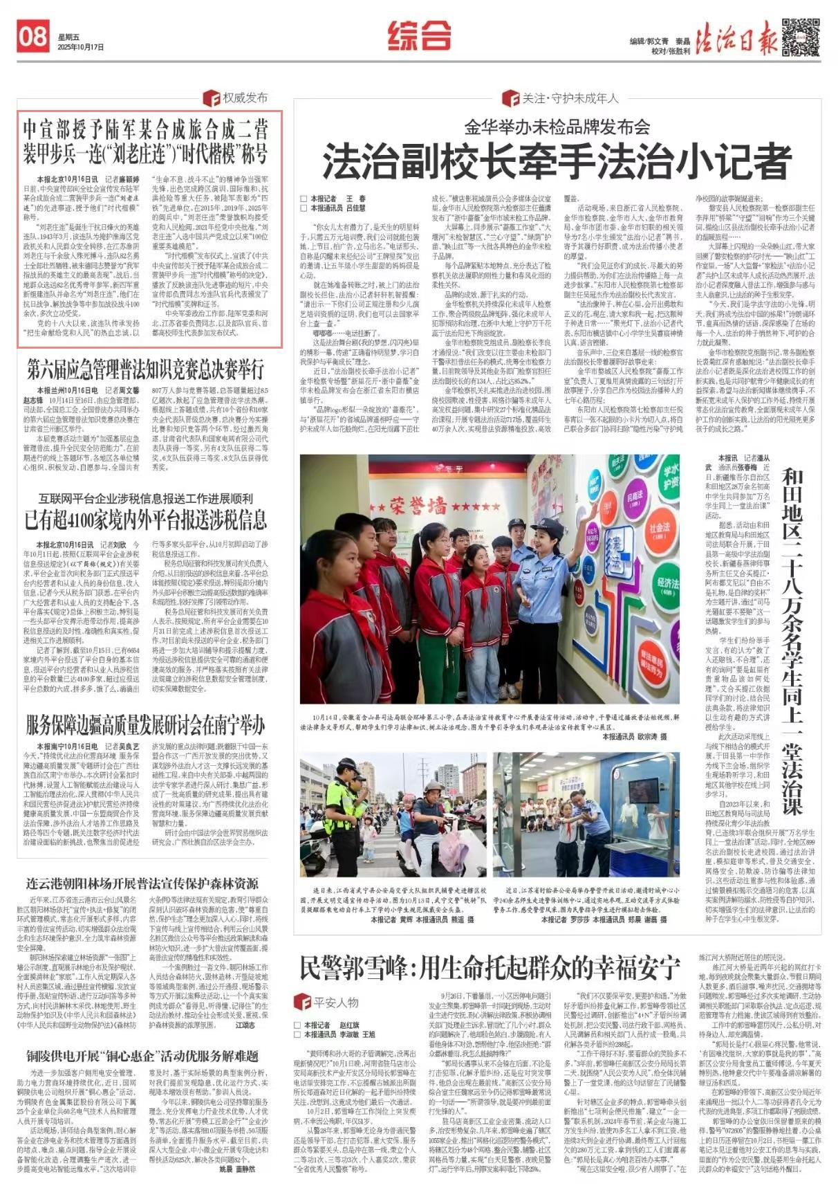 黨的十八大以來,該連隊(duì)傳承發(fā)揚(yáng)“把生命獻(xiàn)給黨和人民”的熱血忠誠,以“生命不息、戰(zhàn)斗不止”的精神爭當(dāng)強(qiáng)軍先鋒,出色完成跨區(qū)演訓(xùn)、國際維和、抗洪搶險(xiǎn)等重大任務(wù),被陸軍表彰為“四鐵”先進(jìn)單位。在2015年、2019年、2025年的閱兵中,“劉老莊連”榮譽(yù)旗幟均接受黨和人民檢閱。2021年經(jīng)黨中央批準(zhǔn),“劉老莊連”入選中國共產(chǎn)黨成立以來“100位重要英雄模范”。
