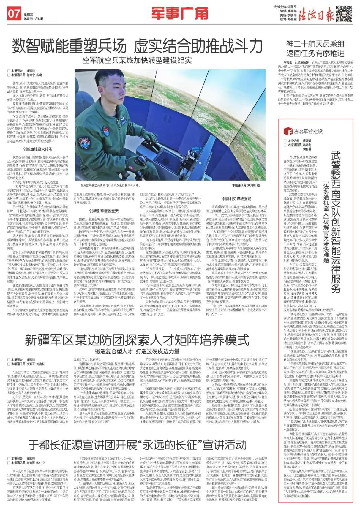 今年初,武警黔西南支隊(duì)黨委將“法務(wù)通機(jī)器人”作為創(chuàng)新普法形式、拓寬服務(wù)渠道的重要抓手,同步納入“常態(tài)法律服務(wù)下基層”工作體系,與“六座連心橋”(心理困惑橋、伙食問(wèn)題橋、法律疑問(wèn)橋、違紀(jì)苗頭橋、傷病困擾橋、打罵體罰橋)中的“法律疑問(wèn)橋”深度銜接,讓智能法律服務(wù)既扎根基層日常,又成為連通官兵需求與法治保障的關(guān)鍵紐帶。