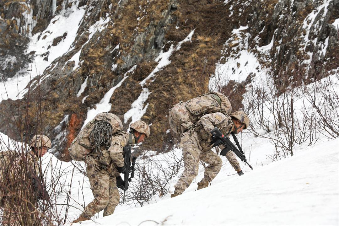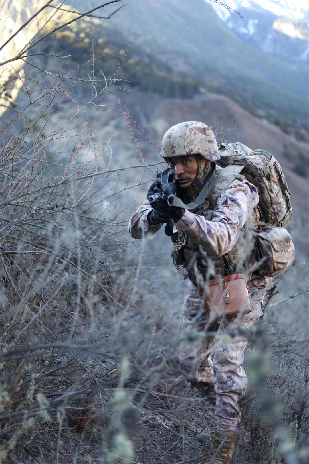 圖為寒風(fēng)凜冽中,次羅布(右一)與戰(zhàn)友屈身前行攀爬險(xiǎn)坡。