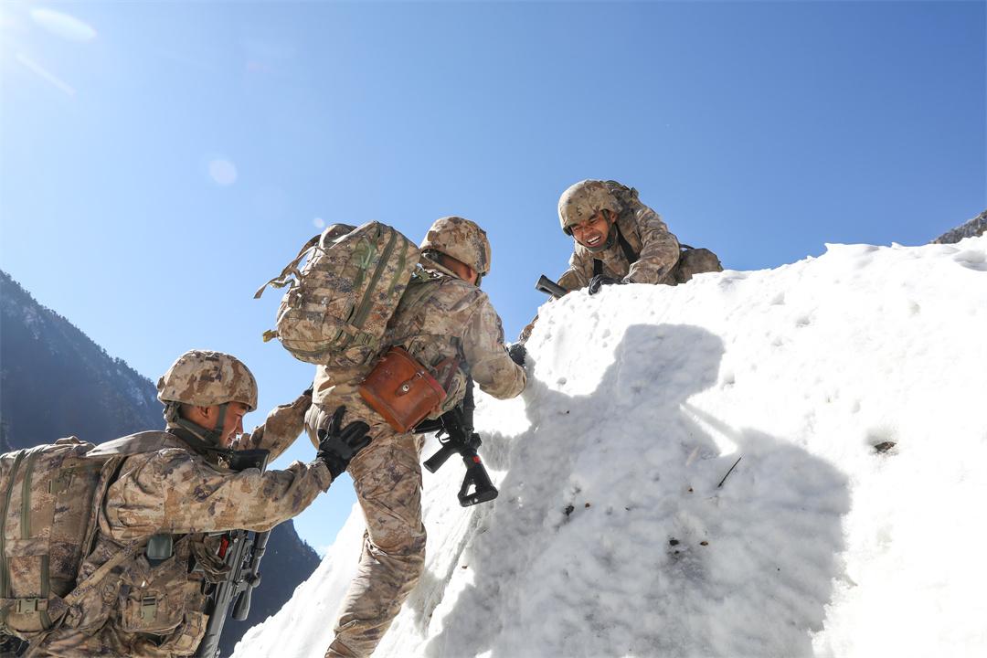 圖為次羅布(右一)與戰(zhàn)友通力協(xié)作,幫助新兵卿金科(右二)登頂雪峰。