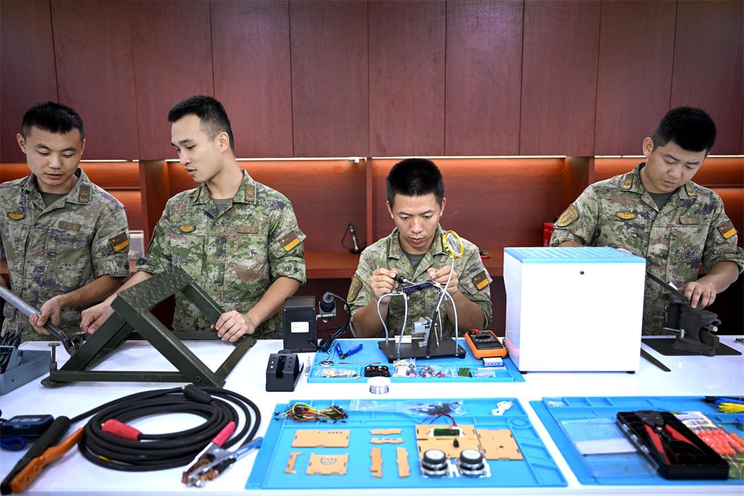 圖為火箭軍某旅發(fā)射二營(yíng)官兵在“淬鋒”創(chuàng)新工作室,開展技術(shù)革新活動(dòng)。劉明松 攝