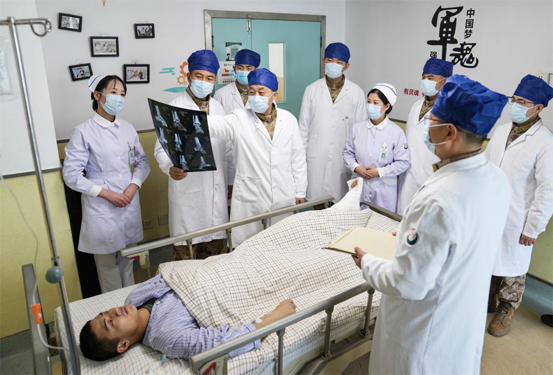 圖為博士團隊在病房里為戰(zhàn)士會診,研究軍事訓練傷防治。張永進 攝