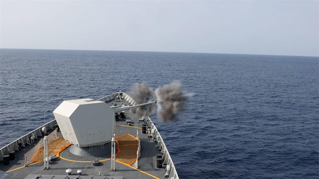 圖為包頭艦防空反導演練,副炮射擊。熊勤鑫 攝