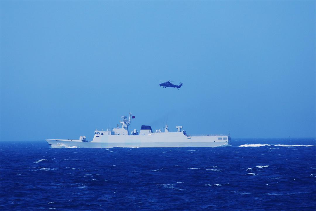 圖為海軍紅河艦在聯(lián)合演習組織艦機協(xié)同訓練。程建明 攝