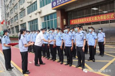 7月6日,強(qiáng)戒一所舉行搶險(xiǎn)滅火見義勇為表彰儀式。強(qiáng)戒一所黨委副書記、紀(jì)委書記賴國強(qiáng)為參與救火的警戒護(hù)衛(wèi)隊(duì)隊(duì)員頒發(fā)榮譽(yù)證書和獎(jiǎng)勵(lì)金,充分肯定警戒護(hù)衛(wèi)隊(duì)對兩次火情的妥善處置,贊揚(yáng)其是一支訓(xùn)練有素、業(yè)務(wù)精湛、有戰(zhàn)斗力的隊(duì)伍。