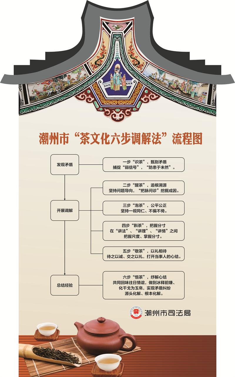 品一杯清茶,解雙方心結(jié)。據(jù)悉,近年來,潮州市堅(jiān)持發(fā)展新時(shí)代廣東“楓橋經(jīng)驗(yàn)”,以潮州工夫茶“和、敬、精、樂”的文化精髓為基礎(chǔ),將“工夫茶二十一式”泡茶步驟與調(diào)解相結(jié)合,創(chuàng)設(shè)特色鮮明的“茶文化六步調(diào)解法”,打造了具有潮州特色的文化調(diào)解品牌。