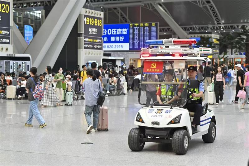 節(jié)日期間,廣鐵公安秉持“警力跟著客流走、警情走”原則,依托客流實時監(jiān)測系統(tǒng),科學(xué)動態(tài)研判大客流風(fēng)險點,優(yōu)化警力配置,加大進(jìn)站口、候車室、出站口等重點區(qū)域巡邏頻次。協(xié)同客運(yùn)部門做好客流疏導(dǎo),保障旅客平安乘降。其中,廣州站派出所與廣州地鐵、越秀公安廣場派出所建立聯(lián)動機(jī)制,強(qiáng)化瞬時大客流應(yīng)對和路地聯(lián)合處突準(zhǔn)備;廣州白云站派出所聯(lián)合白云公安、交警、運(yùn)政等部門開展聯(lián)合執(zhí)法,整治帶客進(jìn)站、代客刷票、叫客拉客等治安頑疾。