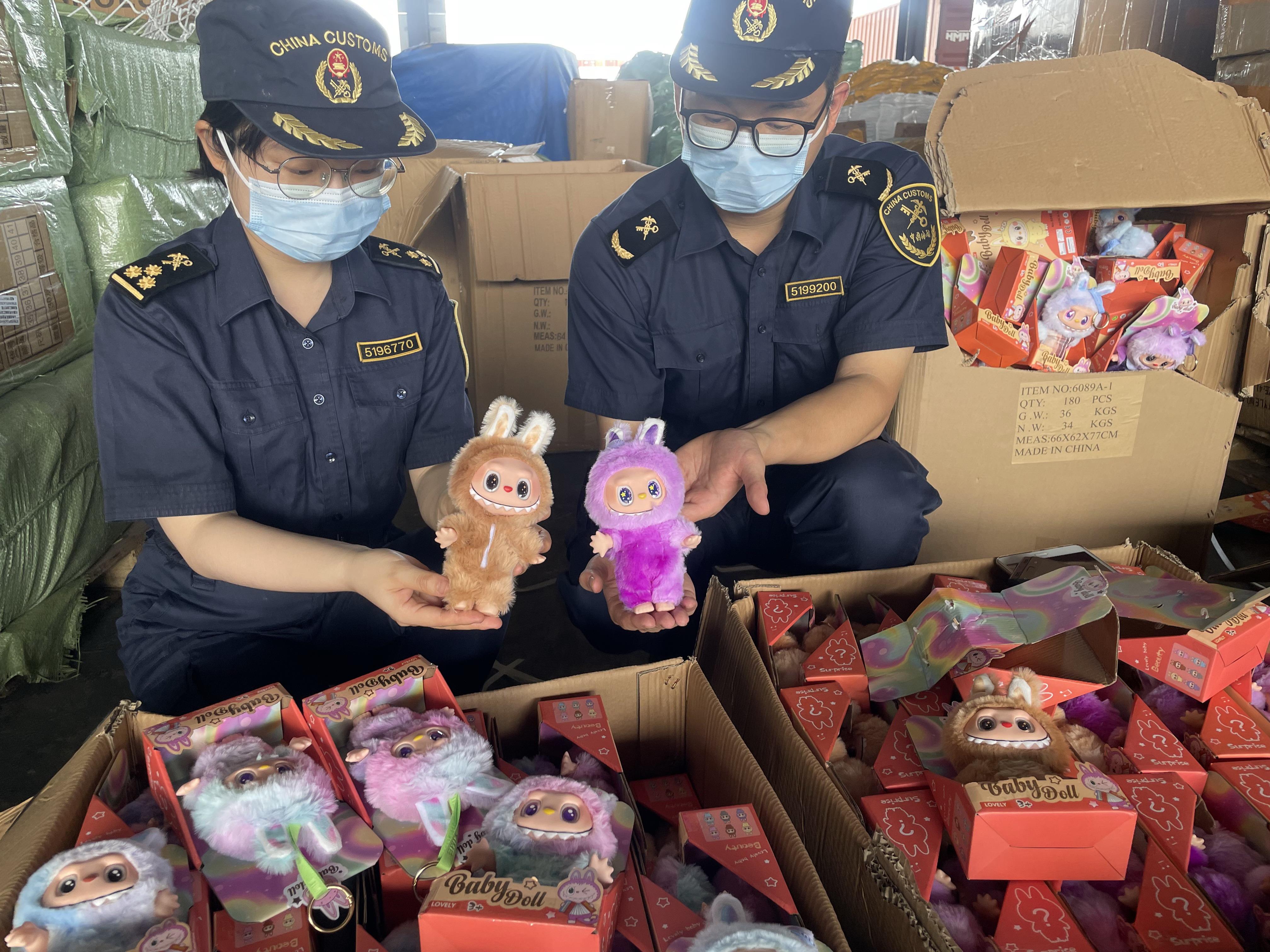 廣州海關(guān)所屬南沙海關(guān)關(guān)員在對一票申報為“玩具”的出口貨物進行查驗時,發(fā)現(xiàn)該批貨物申報為“無品牌”,但紙箱中的毛絨玩具與泡泡瑪特當前熱門的Labubu系列產(chǎn)品高度相似。經(jīng)聯(lián)系相關(guān)知識產(chǎn)權(quán)權(quán)利人確認,上述貨物為涉嫌侵犯其知識產(chǎn)權(quán)的產(chǎn)品。