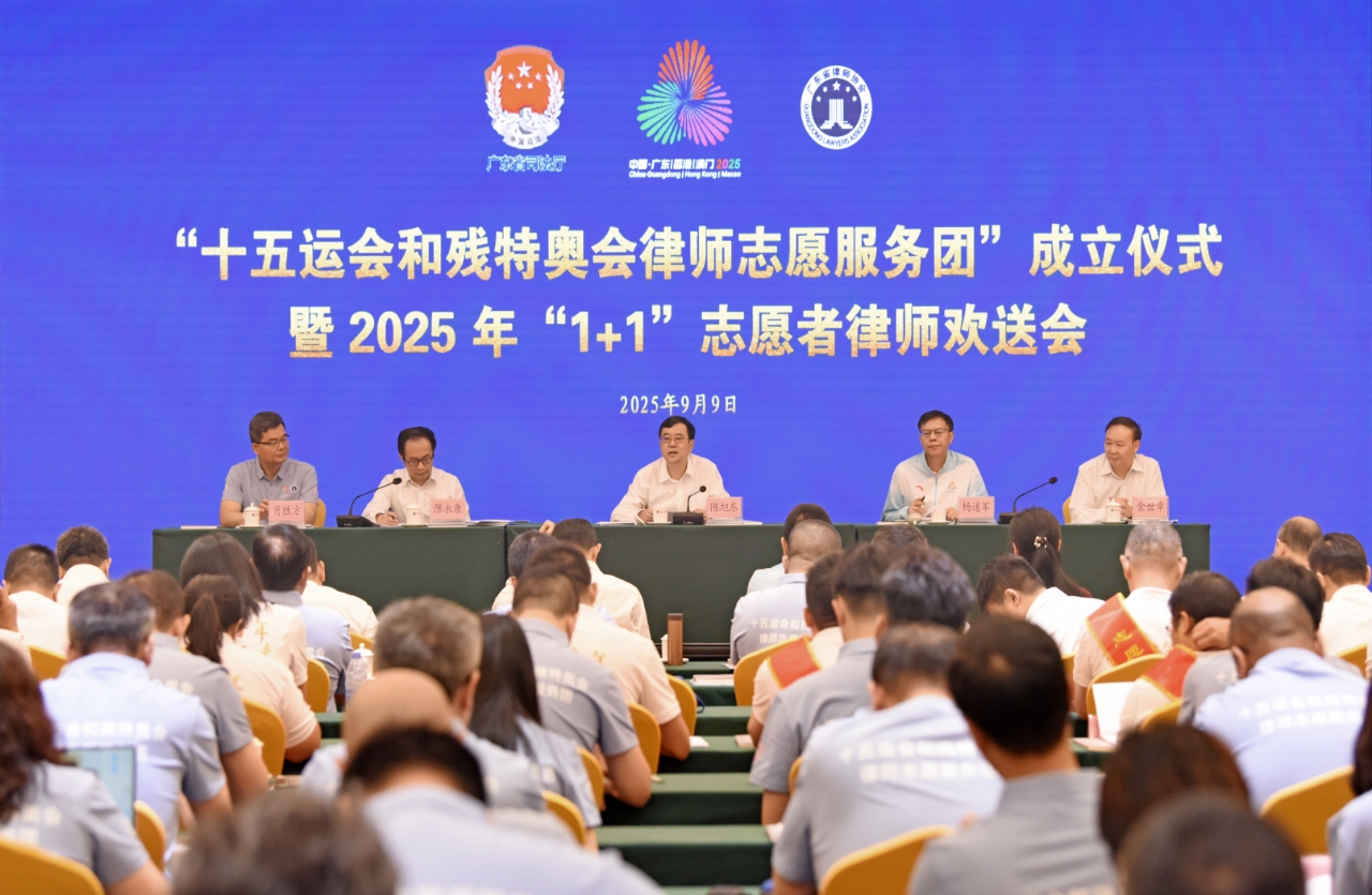 為全力保障“十五運(yùn)會(huì)和殘?zhí)貖W會(huì)”順利舉辦,廣東省律師協(xié)會(huì)積極響應(yīng)省委、省政府“當(dāng)好東道主”的號(hào)召,于9月9日在廣州正式成立“十五運(yùn)會(huì)和殘?zhí)貖W會(huì)律師志愿服務(wù)團(tuán)”,并舉行2025年“1+1”志愿者律師歡送會(huì)。廣東省司法廳黨委書記、廳長陳旭東出席儀式并講話,省司法廳黨委委員、副廳長陳永康主持活動(dòng)。